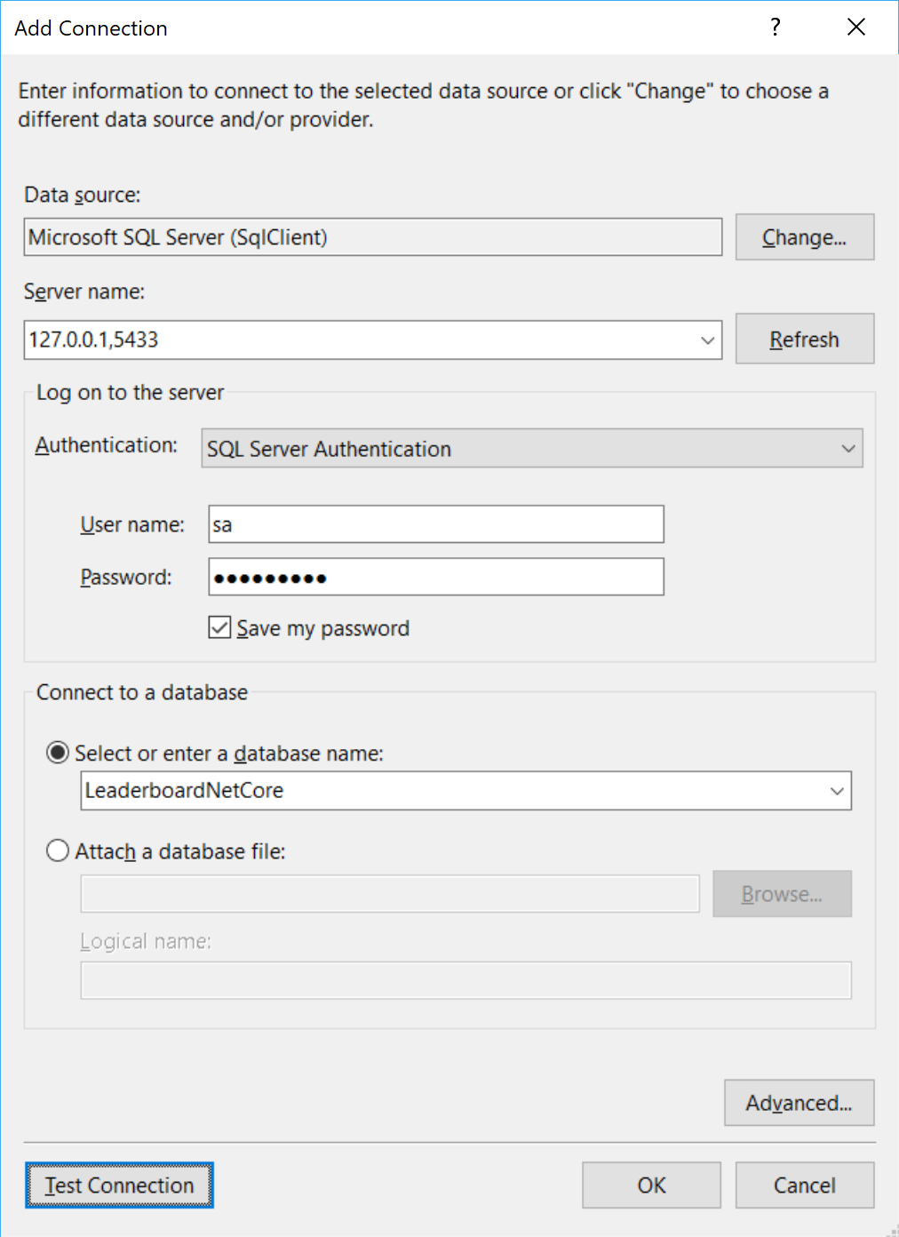 - Server: 127.0.0.1,5433 (notice the comma instead of a colon)